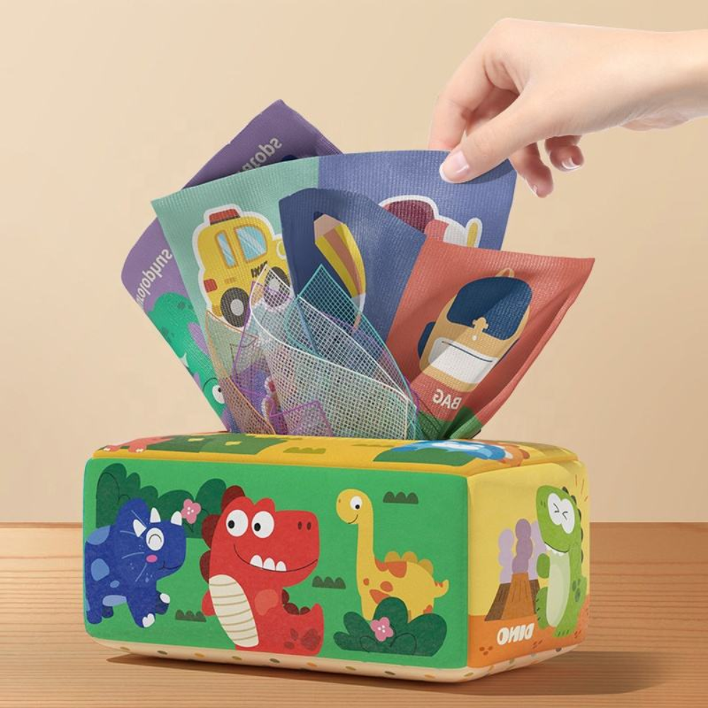 This adorable dinosaur-themed infant toy is designed like a tissue box and made from ultra-soft cotton, perfect for your little one’s gentle touch. Bursting with vibrant colors and a charming dino design, it includes 3 pieces of crinkly sound paper and 6 silky scarves that are safe, fun, and endlessly entertaining to pull out and explore.
