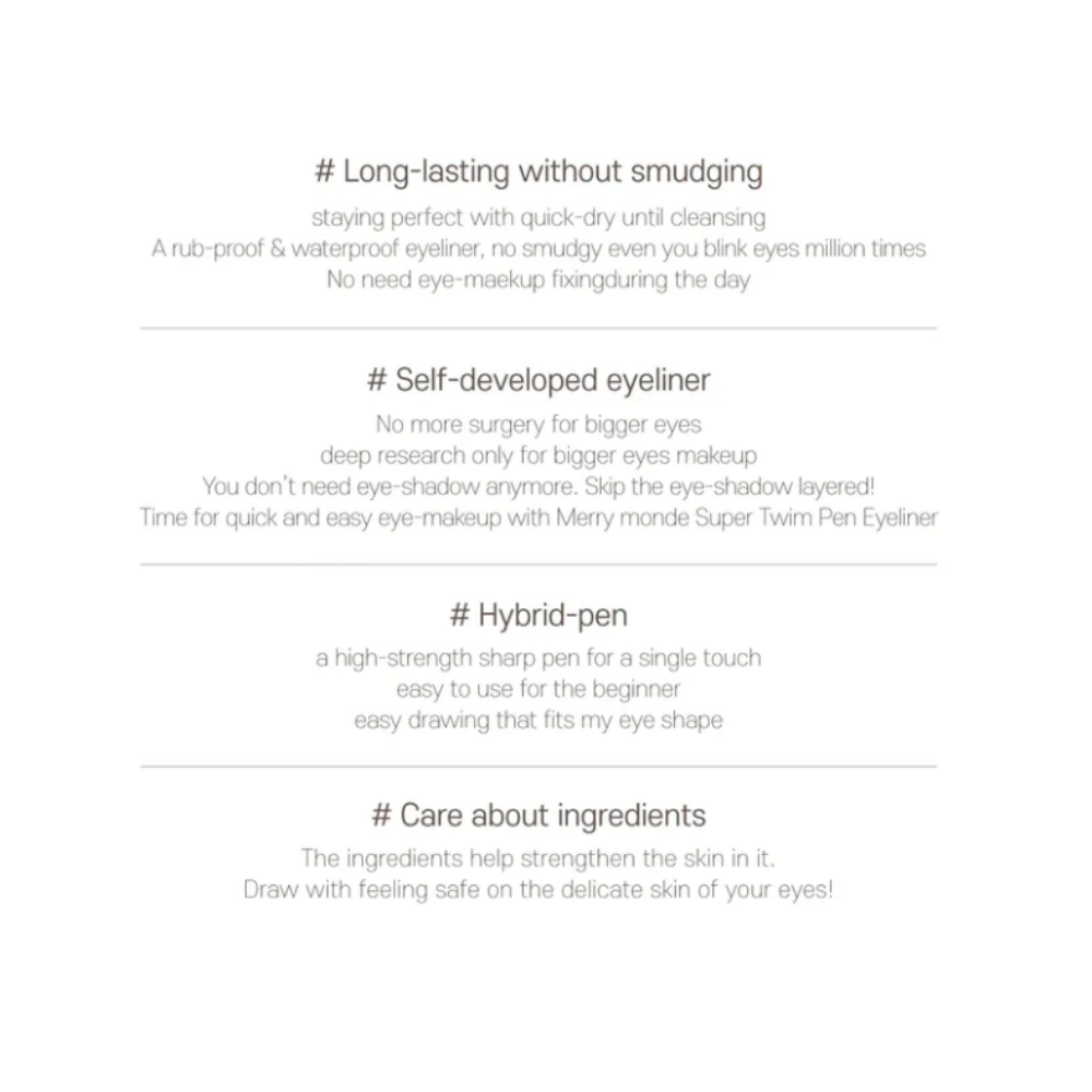Define your eyes with precision and style using the Merry Monde Super Twin Pen Eyeliner. Featuring a dual-tip design, this eyeliner offers both a fine brush tip for sharp, detailed lines and a softer tip for bold strokes—giving you the freedom to create any look, from natural definition to dramatic wings.