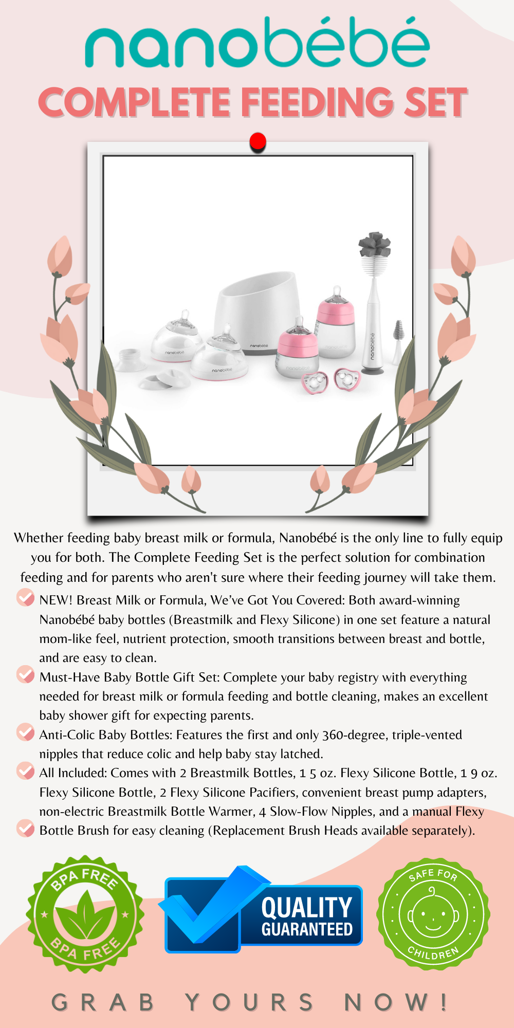 Whether feeding baby breast milk or formula, Nanobébé is the only line to fully equip you for both. The Complete Feeding Set is the perfect solution for combination feeding and for parents who aren't sure where their feeding journey will take them.